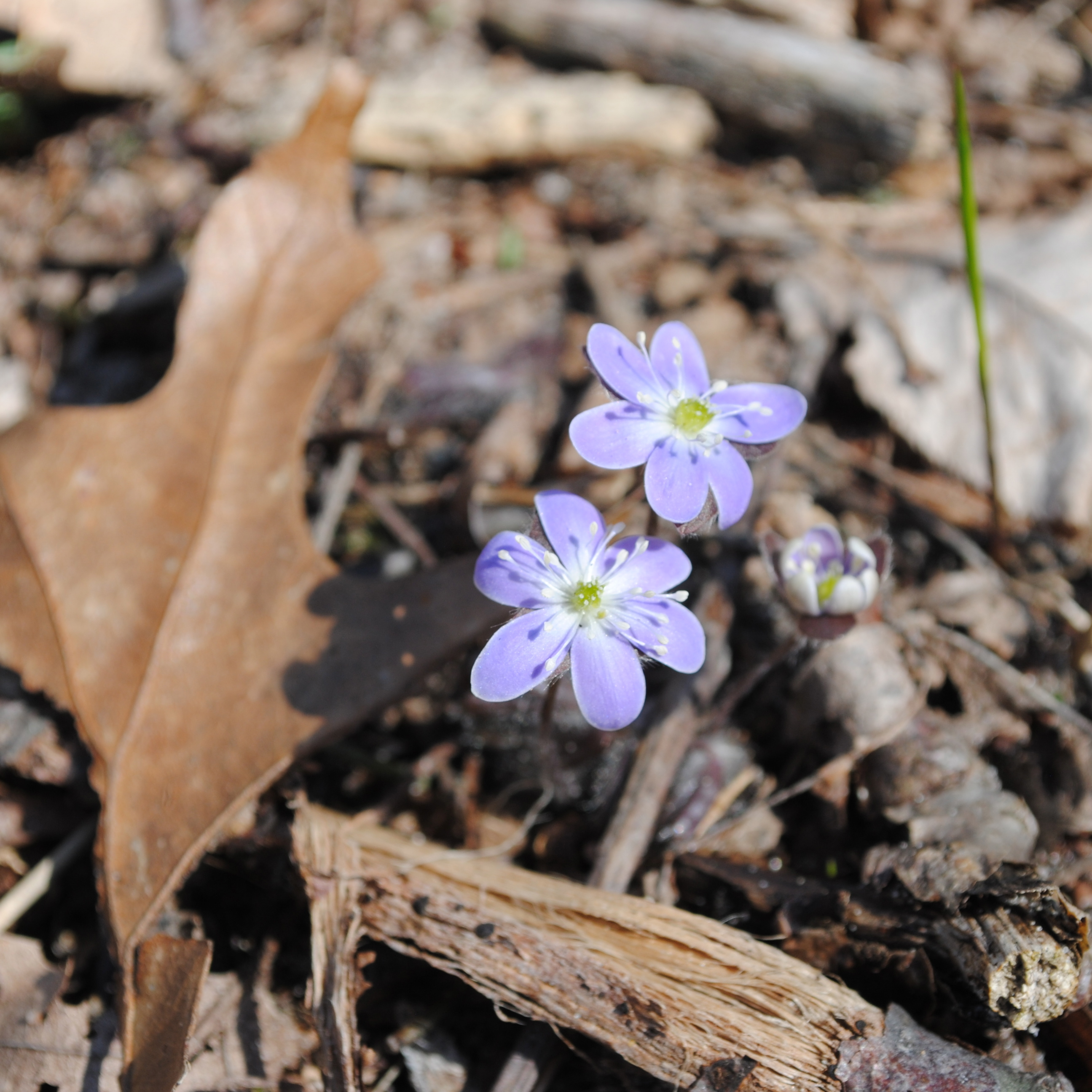 I found a patch of blooming round-lobed hepatica the other day in the still-rather-brown-all-over Saugatuck Dunes. To give you a sense of how tiny these spring ephemerals are, that's a part of a red oak leaf behind the blossoms. Hepatica are usually the first bits of purple I find in the woods around here each April, opening a full month before the violets. A couple of weeks ago, I found one hepatica bud open on a warm day, but the buds have been closed up tight in the cool weather since. They're easy to identify because of their large, three-lobed leaves (hidden here). These flowers are one of a myriad of reasons why we fight the spread of garlic mustard—and stay in the middle of the trail, where they don't grow.
